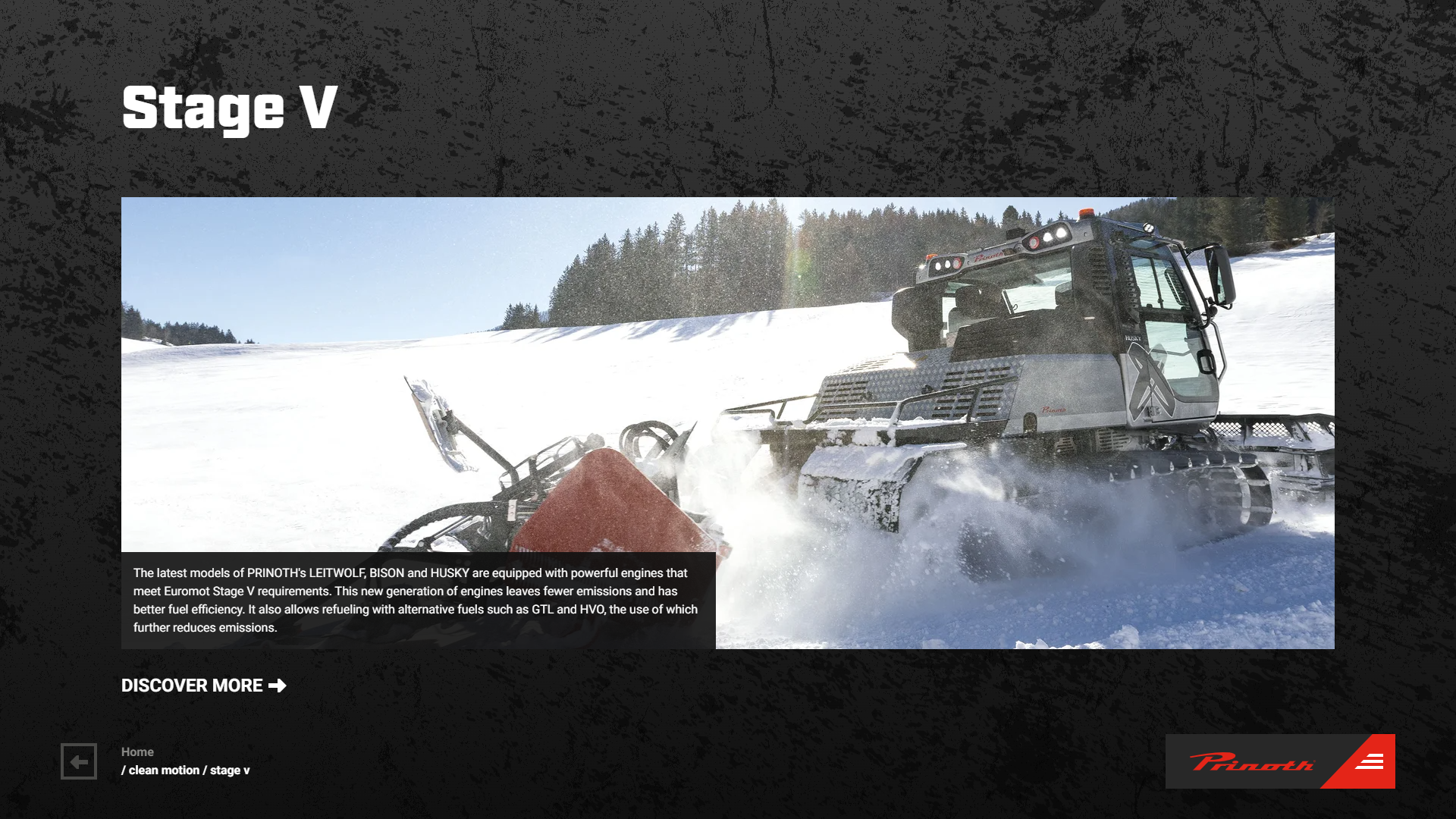The latest models of Prinoth's Leitwolf, Bison and Husky are equipped with powerful engines that meet Euromot Stage V requirements. This new generation of engines leaves fewer emissions and has better fuel efficiency. It also allows refueling with alternative fuels such as GTL and HVO, the use of which further reduces emissions.